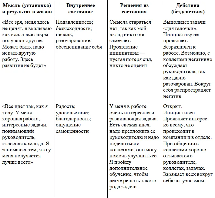 Ниже представлен пример того, как можно видеть одну и ту же ситуацию с точки зрения разных мыслей (установок) и результатов.