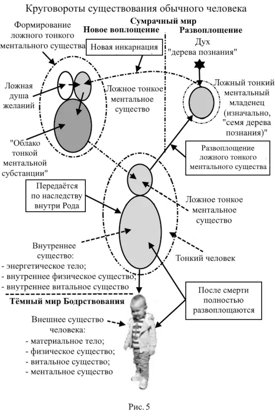 На рисунке 5 показано, что изначально Дух «дерева познания» образует «семя», которое получили Адам и его жена. Далее «семя» развивается до «проростка», который и есть ложная душа желаний с её ментальным «младенцем». Далее уже она формирует из структур Духа «дерева познания» ложное тонкое ментальное существо, используя для этой цели животного человека и его расу, то есть расу Адама и не только.