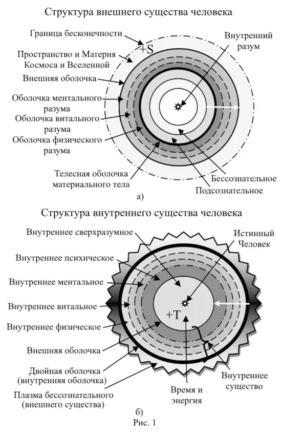 Строения внешнего и внутреннего существ человека изображены на рисунках 1а (внешнее существо) и 1б (внутреннее существо). Разумы внешнего существа показаны на рисунке 1а. Они формируют его внешнюю многослойную оболочку. Внешнее существо заключено между двумя грубыми материальными оболочками: внешней, с её материальным телом, физическим, витальным и ментальным разумами, и внутренней, сформированной Подсознанием и Бессознанием. В структуре грубой внутренней оболочки можно признать планы подсознательного и бессознательного с их субстанциями тёмной Материи. Далее внешней оболочки находится сфера большего Пространства, простирающаяся в бесконечности Космоса, но ограниченная в восприятии нашими внешними органами зрения.