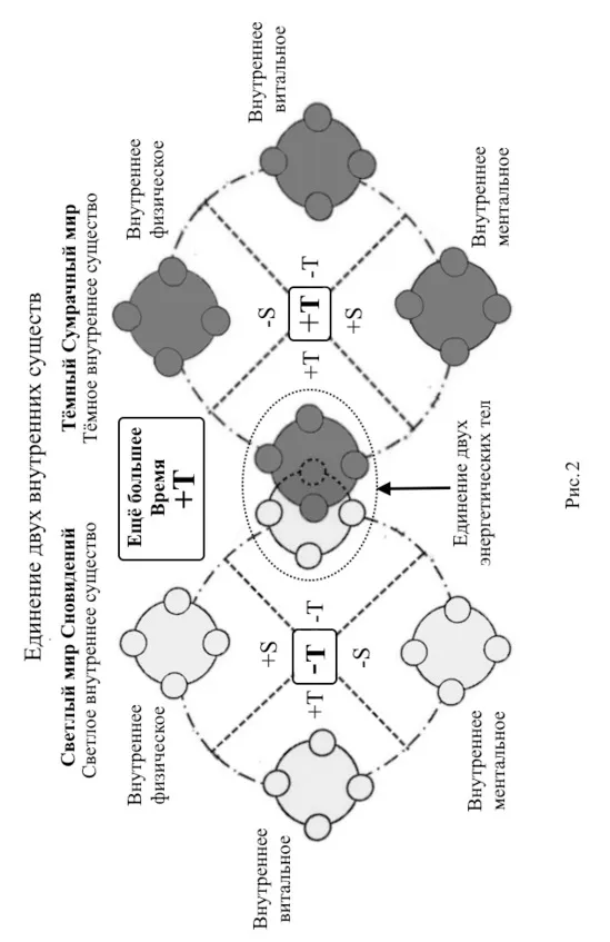 Все они имеют относительно друг друга разные знаки состояний плоскостей внутри своих сфер Времени. Это не позволяет им аннигилировать, но и не даёт возможности соединиться между собой. Через большое «кольцо» своей «модели» они совместно сосуществуют и даже формируют некое единое «серое» внутреннее существо тонкого человека, объединяя в себе его светлый и сумрачный аналоги. Но нам представляется, что они будут работать порознь, каждый в своём мире. Мы приходим к такому же варианту их единения, который ранее описали для светлого и тёмного внешних существ человека.