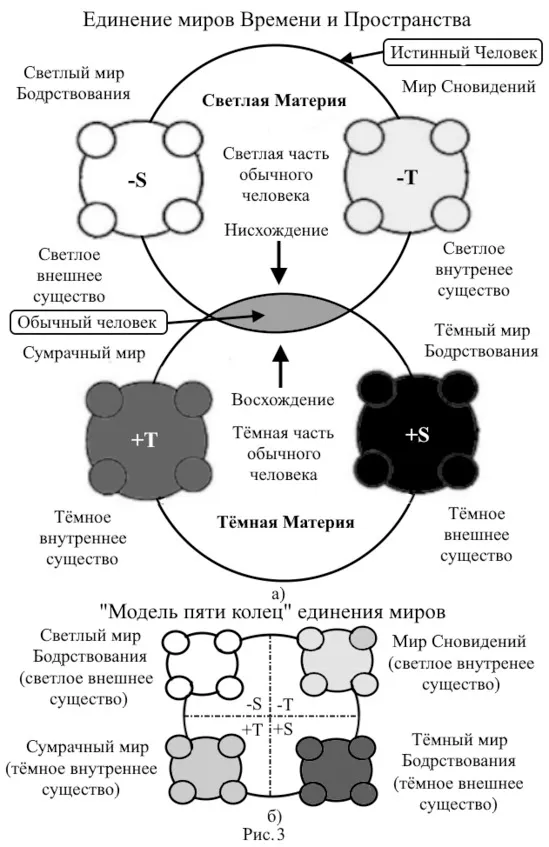 Светлая Материя показана с двумя светлыми мирами: миром Бодрствования и миром Сновидений, с отрицательными знаками состояний Пространства —S и Времени —Т. Большое «кольцо» объединяет оба светлых мира в единое целое, разнося их между собой. Мы его связали с истинным Человеком мира Глубокого сна без сновидений, который управляет двумя низшими мирами Снов светлой Материи. Пока можно говорить только о светлой части ментального человека, далее которого эволюция, даже в светлой Материи, не пошла. Это инволюция нисхождения Света в Материю.