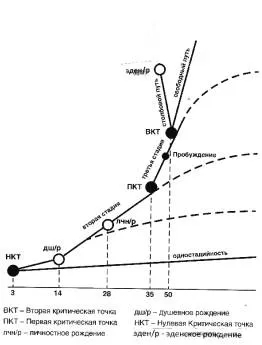 Кривая Пути жизни человека, в действительности, ориентирована не по хроносу, не по физическому времени, а по тому времени, в котором живет плоть, по плотскому времени. Уравнивание плотской жизни мужчины и женщины неправомерно. Ровесников мужчину и женщину нельзя сравнивать ни плотски, ни душевно. Они не сверстники. К тому же плотское время, в отличие от хроноса, течет неравномерно. Потрясения плоти (скажем, от болезни) и, следовательно, плотского времени неизбежны и нужны на Пути как мужчины, так и женщины. Но у мужчины они одно из нормальных условий существования, искажающих график его Путепрохождения. Для женщины же они – норма. По одному этому ясно, сколь сложно говорить о нормативном графике Пути жизни женщины.