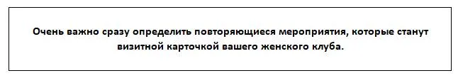 Очень важно сразу определить повторяющиеся мероприятия, которые станут визитной карточкой вашего женского клуба. Их можно будет со временем проводить на регулярной основе: отформатировать, придумать название, слоган, сделать визуальное оформление и яркую подачу. Люди привыкают и уже знают, что вы проводите и как это классно. Например, бизнес-завтраки по средам.