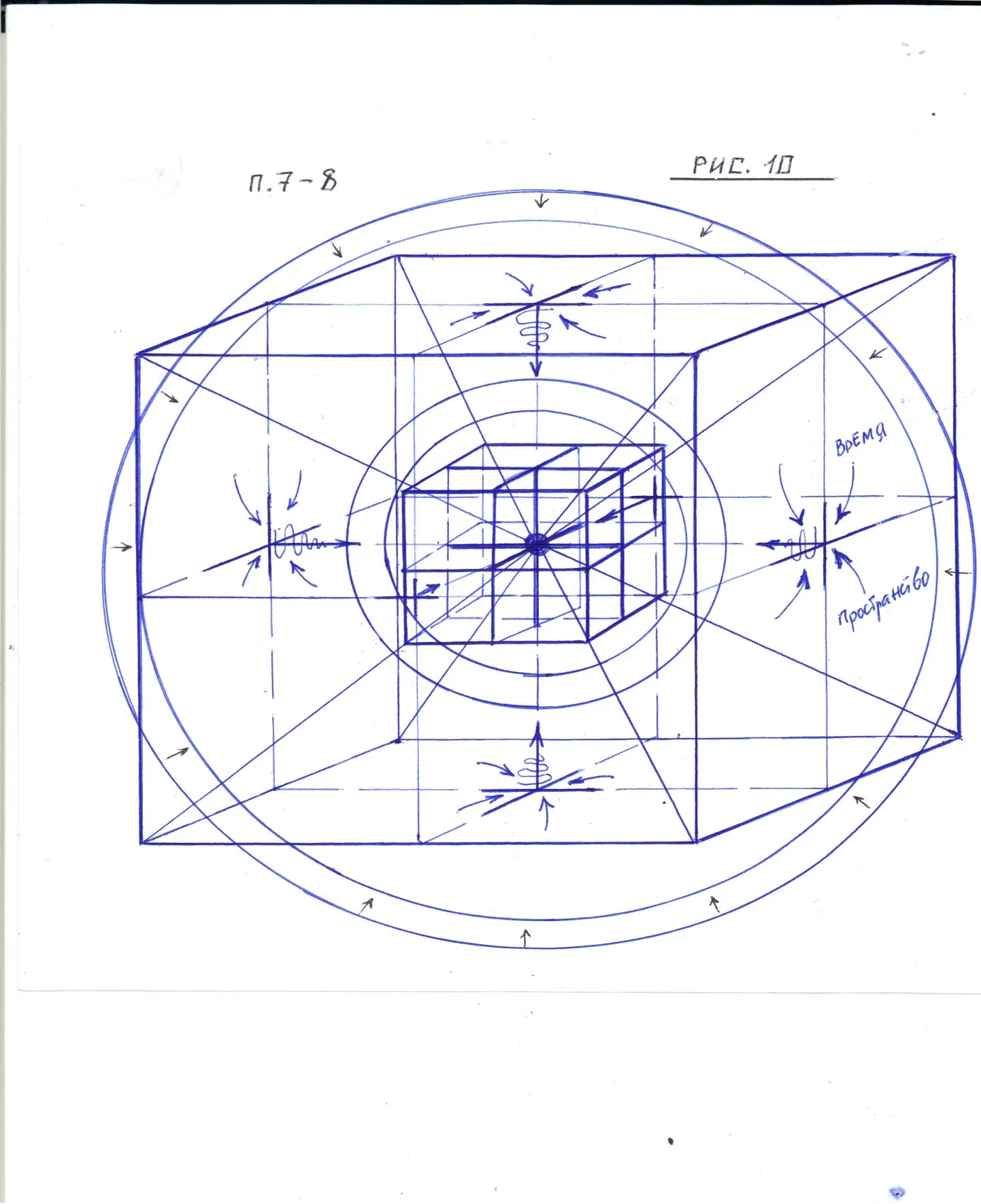 Когда Чаша Накоплений Энергий Творца наполнилась до краев, мгновенно, скачком, внутренний шарик стал огненно-ярким и на острие Питателей, пирамид, вновь вспыхивает Искра Божия. Из нее возникают и вырастают три взаимно перпендикулярные плоскости, по направлениям x-y-z, которые