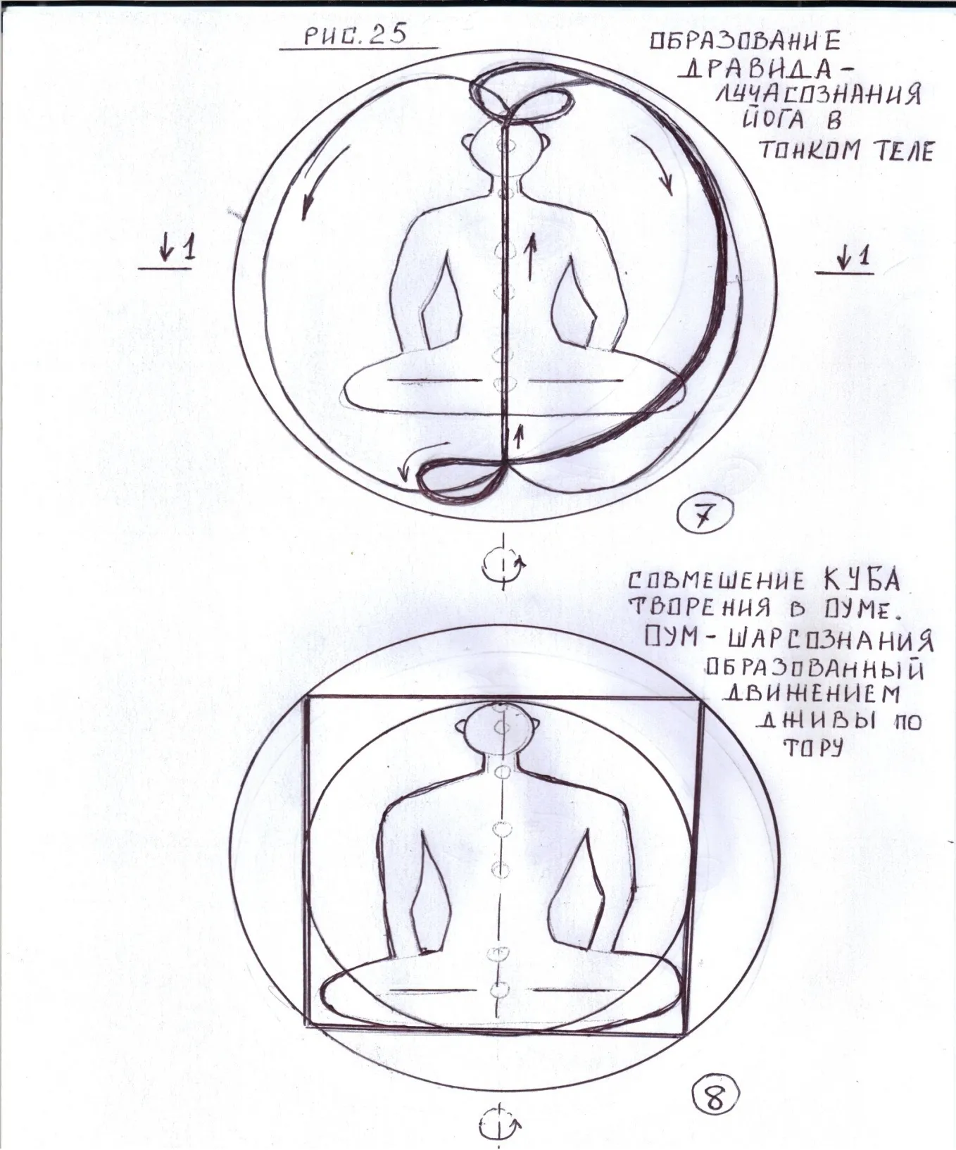 На рис.8 показано совмещение Куба Творения в ОУМе, Шаре Сознания йога. Практикующий йог, силой своей созидающей мысли создал свой световой Шар Сознания, в котором расположен Куб его Творения и он сам внутри Куба Творения, внутри которого вписан Шар Света.