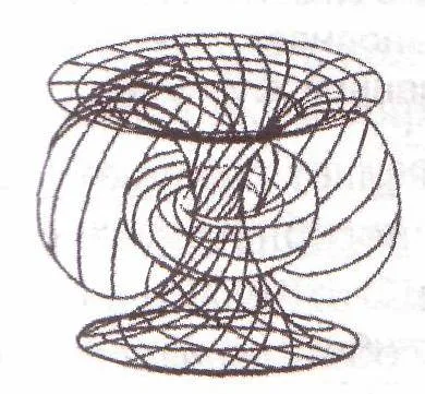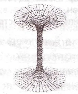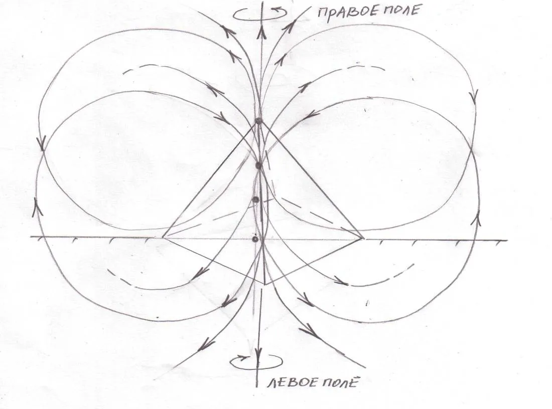 Поля левого кручения имеют центры излучений внутри пирамиды на 1/3 и 2/3 ниже вершины. Эти поля проходят через внутренние области пространства пирамиды, и уносят в своем потоке внешнюю информацию в центр земли, производя очистительные, разрушительные процессы, которые дематериализуют материю и энергию. Эти поля забирают из земли ее реликтовое излучение, и также охватывают по тору пространство вокруг пирамиды.
