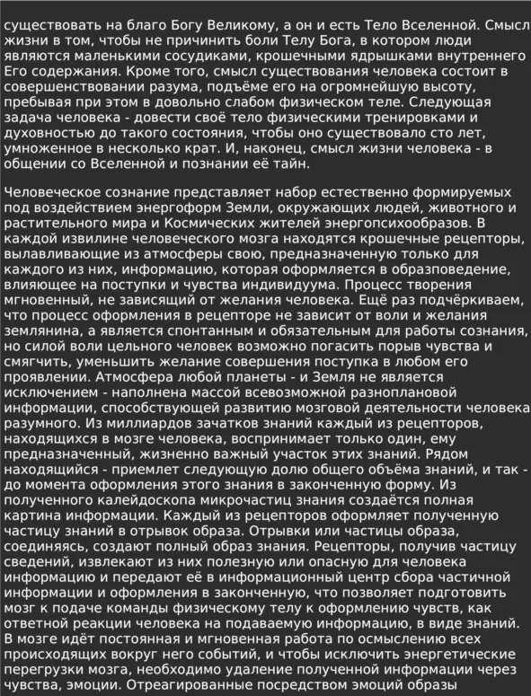 Зло выходит в виде монстров – форм скверного мышления. Это результат фатальной низости человеческого самосознания. Нет падших Ангелов, естъ Души земных жителей, оставившие тело-носитель и имеющие затемнение энергофона до состояния камня, не умеющего подняться вверх без помощи другого субъекта. Душам этим нужна помощь через тепло живых, сострадающих энергоформе, оказавшейся в безвыходном положении. Эти Души не в состоянии выйти за пределы земного притяжения. Нет места понятиям падших Ангелов, ибо чистая Душа чтит Законы Бога Отца и сливается с телом Отца своей чистотой. Разве Отец желает зла частице своего тела? То, что в народе называется порча, – это вселение через пробой энергококона человека тёмных Душ путём мыслепосылов. Вселяют их те же земляне, но попавшая в физическое тело такая Душа назовёт себя служителем Люцифера, ибо его Служба курирует таких жителей в энергоформе. Заканчивая повествование, мы хотим подчеркнуть, что ни в коем случае не собираемся делать ревизию религии, или ставить под сомнение Библию. Мы можем только констатировать, что из многих литературных источников следует, что Библия – это не один раз творчески переработанный документ. И переработан он в пользу главенствующих над церковью, которым было удобно преподать именно их устраивающий вариант.