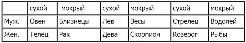 Кроме разделения на мужские и женские знаки или горячие и холодные по Аристотелю, Зодиак разделяется еще на шесть знаков сухих и шесть знаков мокрых или влажных. Эта следующая дуальная пара категорий в учении Аристотеля. Как мы помним из различного сочетания этих четырех категорий Аристотель выводил существование четырех основных стихий или элементов. Здесь Зодиак делится на пары рядом стоящих знаков, начиная с Овна. Овен и Телец сухие, следующая пара: Близнецы и Рак мокрые и так далее. Итак, сухие знаки – это Овен, Телец, Лев, Дева, Стрелец и Козерог. Мокрые это: Близнецы, Рак, Весы, Скорпион, Водолей и Рыбы. При реальном истолковании гороскопа это деление знаков не получило такого распространения как деление знаков на мужские и женские. Однако, оно важно при описании темперамента и конституции человека. Абу Машар арабский астролог свел эту классификацию знаков в удобную таблицу: