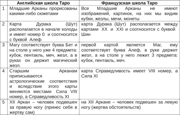 То есть, каковы же пять основных различий между французской и английской системами (школами) Таро: