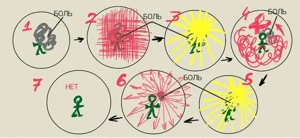 1. Болит голова, например. Рисуем себя. Задаем вопрос: «Помехи, приводящие к головной боли?» Интуитивно рисуем эти помехи в виде каракулей рядом с собой. Как это не покажется странным, интуиция нарисует именно эти энергетические помехи. Рисуем круг для концентрации на помехах.