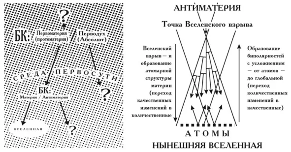 И Вселенная, и СуперВселенная представляют из себя многочисленные биполярные конструкции (БК) в каждой отдельно взятой части, что означает, что предлагаемые выше схемы (ранее опубликованы в книгах «Философия биполярности: Мир, Россия, мы» – 2000 г., а также И-1), графически – лишь некое подобие действительности – на них мы видим лишь основные биполярные преобразования отдельных уровней Суперпространства, внутри которого находимся мы, а потому – фактически составляющих часть нас, как мы, в свою очередь, являемся частью их. Более высоких (и низших) уровней – неисчислимое множество, это и есть – Бесконечность, причем мозаика МНОГОЧИСЛЕННЫХ БК НИКОГДА НЕ СКЛАДЫВАЕТСЯ ОКОНЧАТЕЛЬНО В СВЕРГИГАНТСТКУЮ ВСЕЛЕНСКУЮ БИПОЛЯРНОСТЬ – налицо лишь ПРОЦЕСС СТРЕМЛЕНИЯ, ТЕНДЕНЦИИ сложиться – это и есть ОСНОВА, ДВИЖИТЕЛЬ ВСЕОБЩЕГО ВСЕЛЕНСКОГО ПРЕОБРАЗОВАНИЯ, РАЗВИТИЯ И ДВИЖЕНИЯ. Мы не можем представить себе визуально, что представляет из себя этот процесс постоянного преобразования высших уровней биполярностей, ЧТО и КАК преобразовывается, так же, как невозможно воспроизвести все БК низшего уровня из-за их множественности; предполагается, что любое преобразование «вниз» либо «вверх» обязательно сопровождается «внутри» и «вне» многочисленными изменениями биполярностей самого различного уровня и сложности. Ниже мы попытаемся обосновать эти процессы, предложив читателю в форме структурно-логических схем действие основных законов биполярной диалектики.