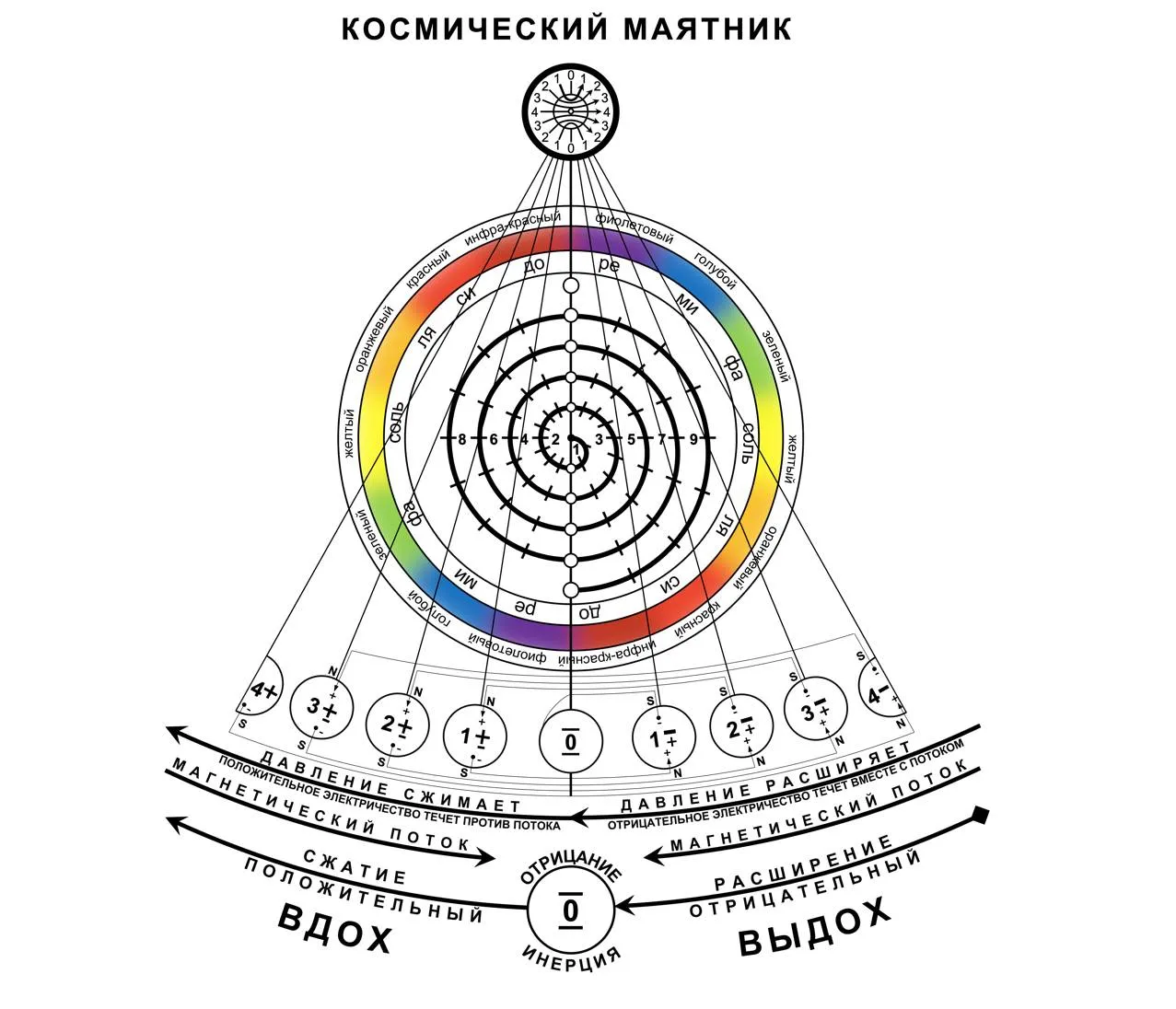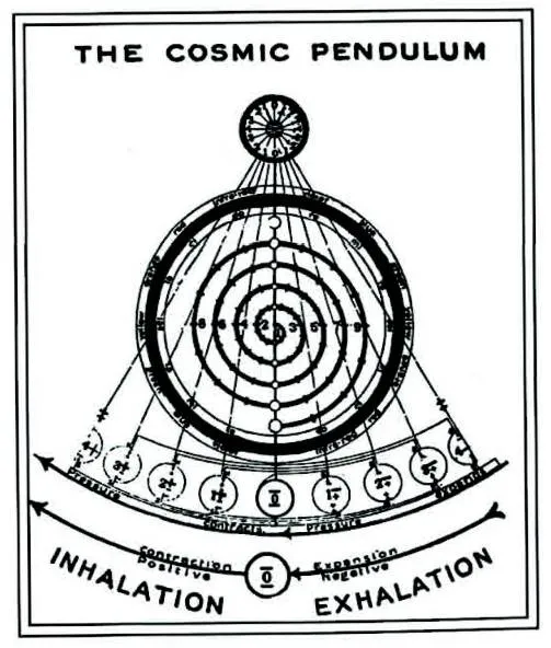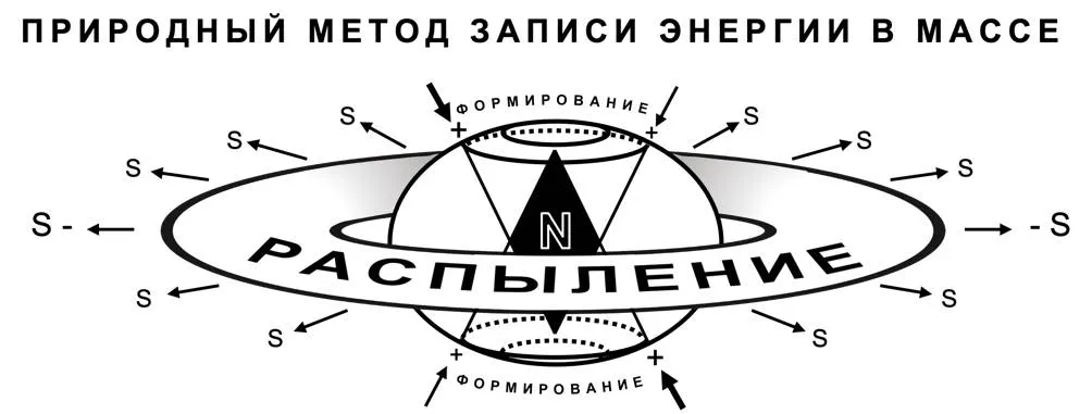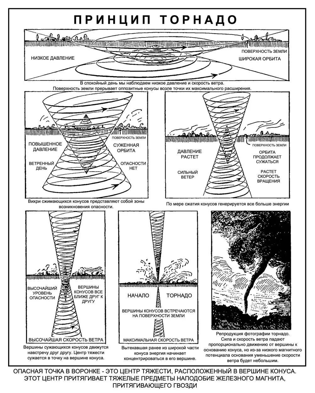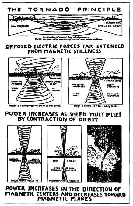 Циклоны, водяные и воздушные смерчи возникают на поверхности нашей планеты в тот момент, когда спирали начинают сжиматься вокруг своей центральной оси. Чем ближе витки спиралей к оси, тем быстрее идет движение. Когда спирали настолько широки в своем основании, что с земли почти не ощущается их последующее сужение, наступает период спокойствия и тишины. Когда же спирали закручиваются в тугие карандаши и стремительно вращаются вокруг своих осей, расположенных под углом в 90 градусов относительно поверхности земли, они могут нанести серьезный ущерб (рис. 66).