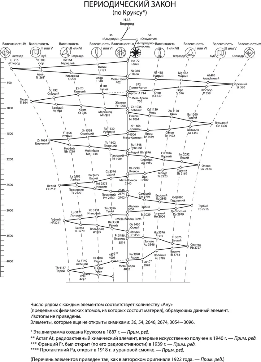 Периодическая система элементов Уильяма Крукса из книги «Оккультная химия», 1908 г., перепечатанная в книге Ч. Джинараджадаса «Основные положения теософии», 1922 г.63