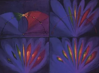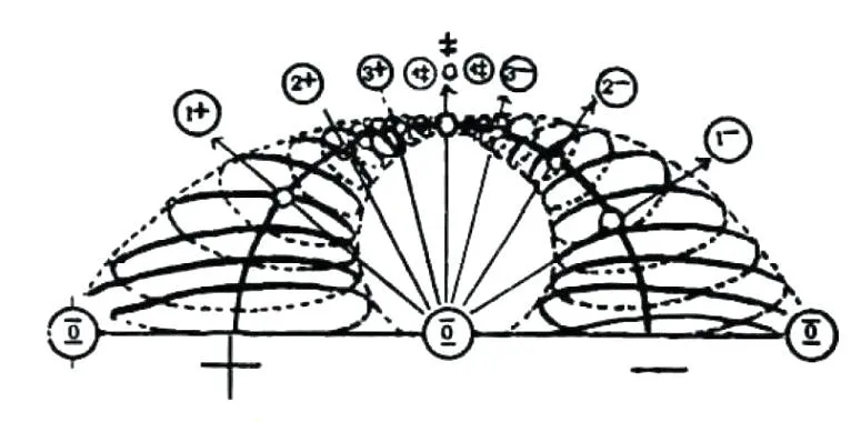 На следующей октаве по мере продолжающегося старения углерода он становится родием и снова достигает своей амплитудной позиции, преодолевая пять состояний, затем спускается с нее снова преодолевая пять состояний. Родий обладает большей жизнеспособностью, нежели кобальт, его температура плавления равна 1 950 °C (рис. 70).