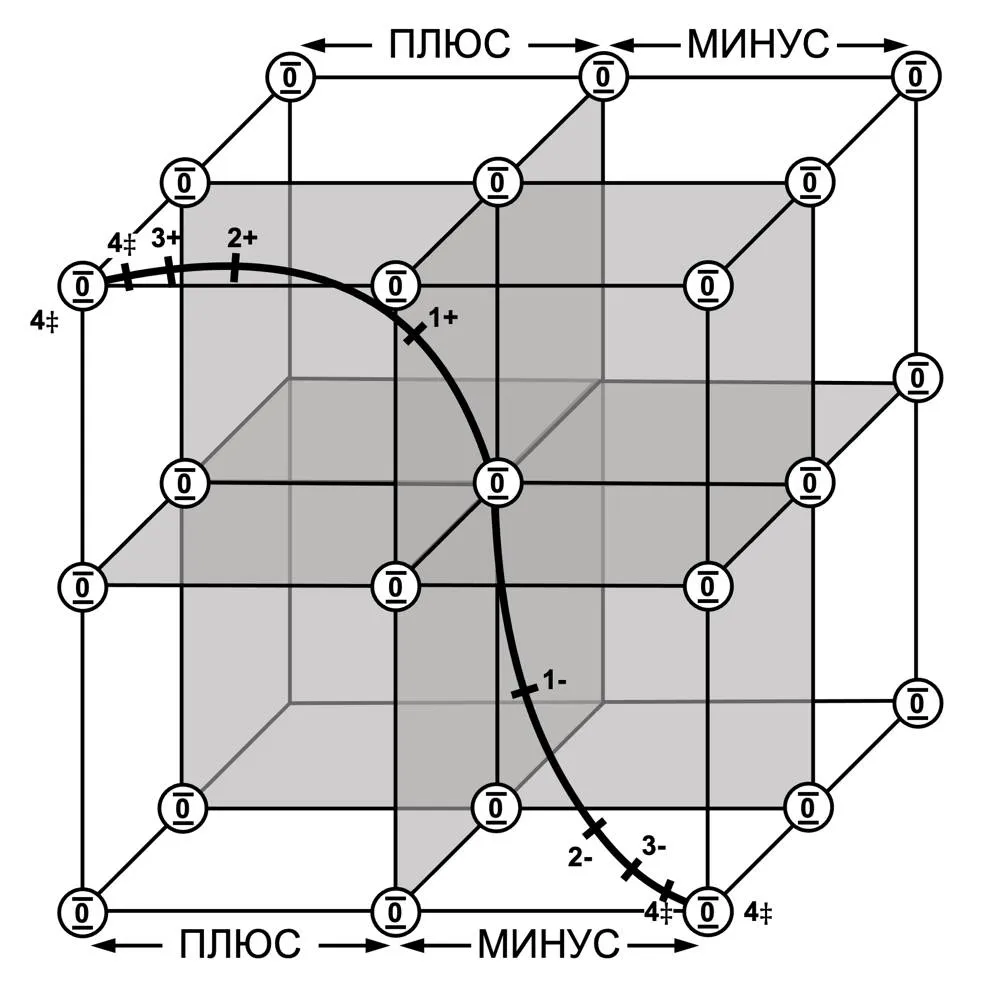 Три зеркала действия – это три пересекающихся внутренних грани куба85, а три зеркала реакции – это внешние граничные плоскости волнового поля.