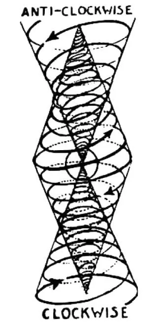 Природное расширение и сжатие, приводящее к аналогичной пульсации всех форм, также является причиной уплотнения материи на полюсах и ее дезинтеграции на экваторах. Материя уплотняется в сферы благодаря сжатию на гребне волны одной пары спиралей вокруг их общей оси, и распыляется благодаря другой паре спиралей, которая расширяется в моменты, когда амплитуда волны приближается к нулю.