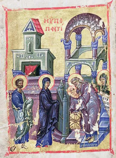Сретение. Миниатюра. Менологий Димитрия Палеолога 1322–1340 гг.