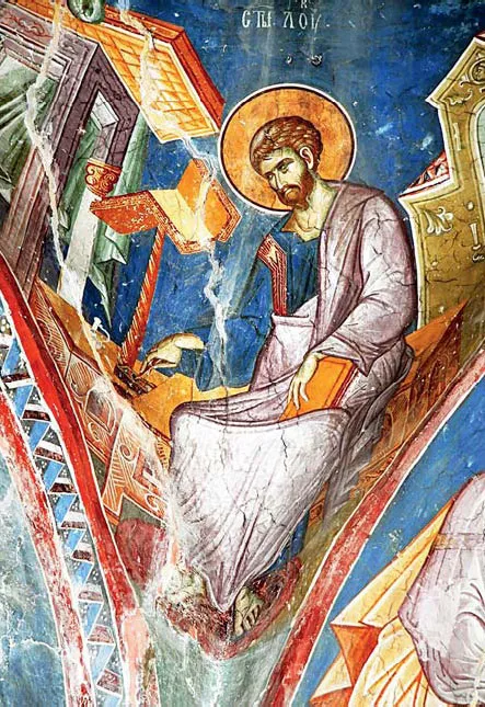 Святой апостол и евангелист Лука. Фреска. XIV в. Церковь Св. Димитрия в монастыре Печская Патриархия, Косово, Сербия