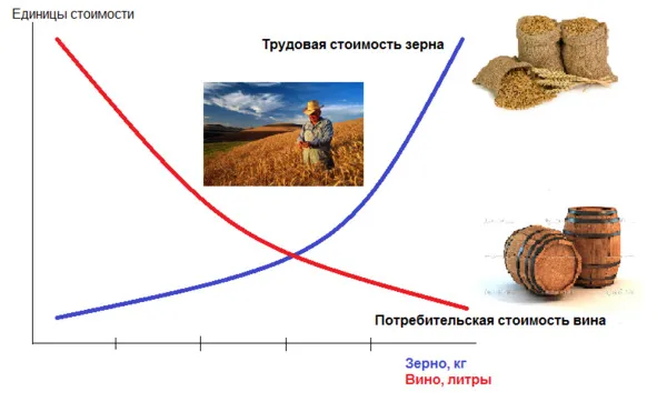 С точки зрения виноградаря, процесс обмена будет выглядеть точно так же. Первые килограммы зерна будут представлять для него наибольшую потребительскую стоимость, и он с удовольствием обменяет на них вино. Но по мере увеличения количества приобретаемого зерна, потребительская стоимость зерна для виноградаря будет падать, а трудовая стоимость вина, напротив, возрастать. И для виноградаря также наступит предел, дальше которого он уже торговаться и обменивать вино на хлеб не станет.