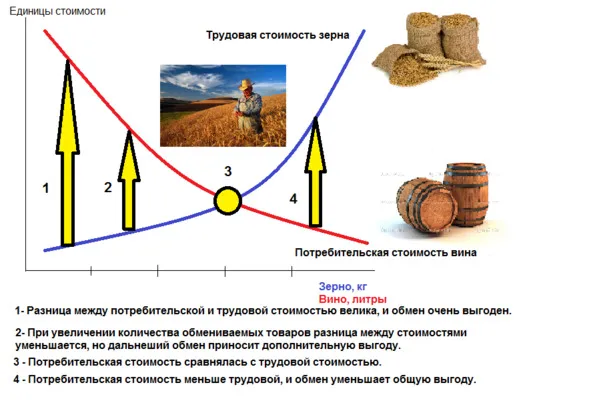 Но чем большее количество зерна обменивается на большее количества вина, чем более возрастает объем сделки, тем меньше становится разница между потребительской стоимостью чужого товара и трудовой стоимостью своего товара, так как потребительская стоимость чужого товара с каждой новой единицей все уменьшается, а трудовая стоимость своего товара все более возрастает. Но торг продолжится, так как, хотя эта разница все время уменьшается, она все-таки существует, а значит, дальнейший обмен принесет дополнительную выгоду.