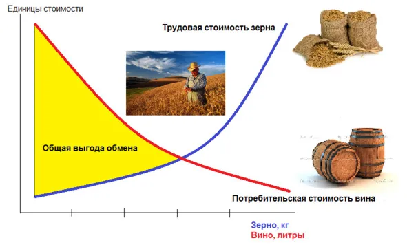 Таким образом, условием прекращения торга является равенство потребительской стоимости какой-то единицы чужого товара и трудовой стоимости какой-то единицы своего товара для одного из участников обмена. Или, если говорить языком математики, равенство предельной трудовой стоимости и предельной потребительской стоимости. Именно при таком объеме обмена товарами и при такой пропорции один из участников обмена получит максимальную выгоду, и дальнейший обмен лишь уменьшит его общую выгоду. Но и второй участник обмена также получит значительную выгоду от обмена, хотя, возможно, при продолжении торга и увеличении объема сделки он мог бы ее еще несколько увеличить.