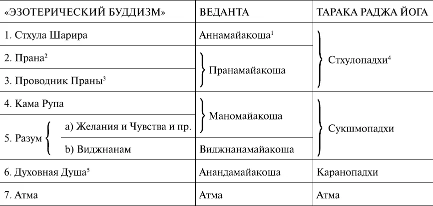Здесь мы даем в форме таблицы классификацию принципов человека, принятую учителями Буддизма и Веданты.