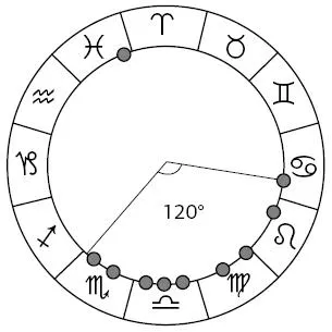 Эта фигура, по сути дела, представляет собой «связку» с дополнительной ручкой: основная часть планет в ней занимает сектор около 120°, а в противофазе к этому стеллиуму находится еще одна планета (см. рис. 5).