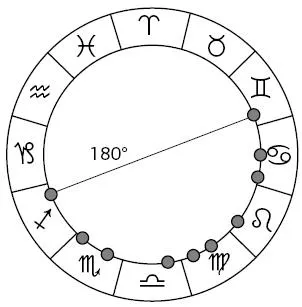 Для этой фигуры характерно скопление планет в границах сектора, равного 180° ± 20°, в остальных знаках – их может быть до пяти-шести подряд – не расположено ни одной планеты (см. рис. 8). Иначе говоря, все небесные тела находятся только в одной половине неба и образуют словно в заполненный наполовину сосуд.