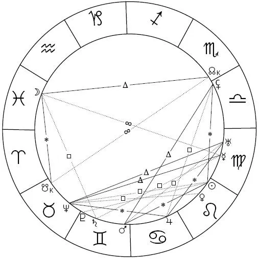 На рисунке видно, что космограмма – это зодиакальный круг из двенадцати отрезков, знаков зодиака (см. рис. 1). Солнце, Луна, планеты и прочие важные точки обозначены в нем специальными знаками. Каждое небесное тело находится в определенном секторе и имеет собственные числовые координаты. Линии между ними – это аспекты, говоря иначе – энергетические соединения, которые образуют планеты в момент рождения человека.