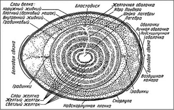 Обычное яйцо тоже имеет несколько слоев: под твердой скорлупой находятся две тонкие подскорлупы и несколько слоев белка и желтка (рис. 23).