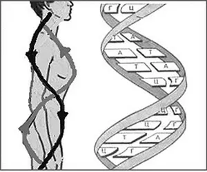 Он представляет собой волну из четырех изгибов позвоночника (шейного, грудного, поясничного и крестцово-копчикового) и четырех изгибов самого тела. Все эти волны обязаны своим возникновением обычной спирали ДНК, из которой создан наш организм (рис. 34).