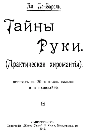С первых страниц вы попадете в необычный мир – в мир учений о хиромантии, астрологии, френологии, право на существование которых оспаривалось во все времена, начиная с древнейших, но, тем не менее, волнующих и привлекающих внимание человечества до сих пор. Впрочем, пропаганда оккультных наук не входит в наши задачи. Мы рады возможности дать новую жизнь незаслуженно забытой книге. Надеемся, что читатель сам сделает вывод о художественной ценности произведения и о том, насколько его содержание соответствует современному миропониманию.