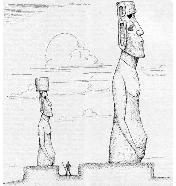 Вот она из версий. Если истуканы, созданные в Ранний период, редко превосходили в высоту два-три метра (правда, высота коленопреклоненной статуи – 3,67 м), то в Среднем периоде скульптуры становились все выше, достигая чудовищных размеров. Самая большая из установленных на аху статуй проделала путь в семь километров до Аху Те-пито-те-кура. Этот монолит весил около 82 т, высота его 9,8 м. К тому же голову его венчал цилиндр весом 11,5 т и высотой 2,4 м. Самое большое раскопанное изваяние из числа временно установленных у подножия Рано Рараку – статуя №295 достигало в высоту 11,4 м; среди незаконченных истуканов, лежащих на спине в мастерской, самый длинный – 20,9 м.