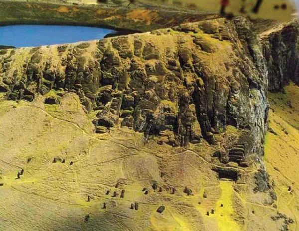 Южный склон Рано Рараку на острове Пасхи буквально усеян большим количеством моаи [113]. Средний размер статуй здесь немного меньше, чем на внешней стороне кратера и сделаны они намного грубее. До сих пор неизвестно, зачем было делать статуи внутри кратера, ведь вытащить оттуда многотонную монолитную скульптуру без повреждений даже в наше время с применением техники – весьма сложная задача. Есть гипотеза – это ни что иное как учебная площадка острова [113]. Все моаи, вопреки распространённому мнению, «смотрят» вглубь острова, а не в сторону океана.