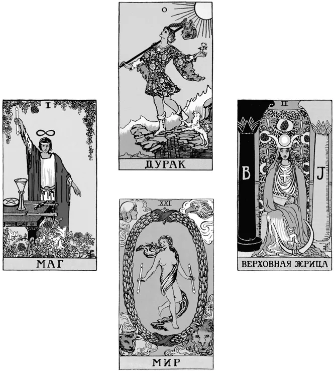 Если у вас есть под рукой колода Таро Райдера – Уэйта1, вытащите из нее Шута, Мага, Верховную Жрицу и Мир и выложите их ромбом, как показано ниже. Посмотрите на них. Обратите внимание, что Шут и Мир изображают радостные танцующие фигуры, тогда как Маг и Верховная Жрица кажутся неподвижными. Если вы взглянете на остальные Старшие арканы, то заметите: на всех, кроме карт 0 и 21, фигуры изображены в статичных позах, словно для фотографии, а не так, будто это случайный кадр из фильма.