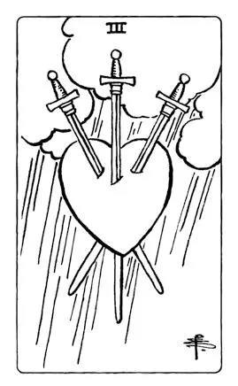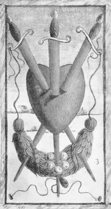 Рис. 1. Десятка Мечей Таро Сола-Буска (слева) стала прообразом Десятки Жезлов Таро Уэйта