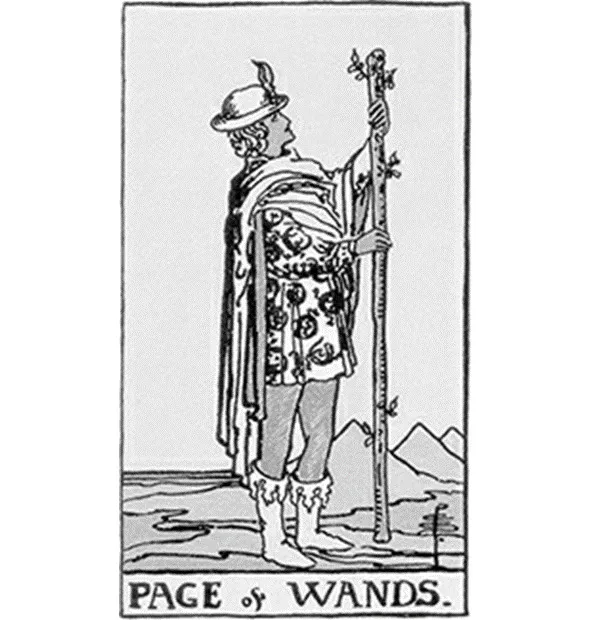 Паж Жезлов представляет ранние стадии ситуации или начинания. Он показывает оптимистичное отношение, энтузиазм и стремление к успеху. Если карта представляет человека в Вашей жизни, это может быть младший родственник или друг, ученик, студент или помощник. Это «карта ученика». Иногда она указывает на человека с детским (или инфантильным) характером, независимо от возраста.
