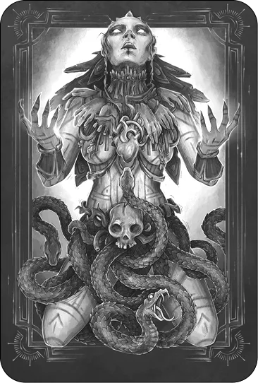Коатликуэ – богиня земли и огня, начала и конца жизни у ацтеков. В начале времен она пожертвовала жизнью, чтобы возродить Солнце. Мудрые змеи проникли в подземное царство и помогли ей воскреснуть. Теперь богиня неразлучна со своими спасителями. Свободолюбива, упряма и никогда не будет жить в неволе. Ногти ее тверды, как у орла, чтобы копать могилы – символ смерти, ведь земля порождает и поглощает все живущее. Коатликуэ сочетает в себе мужское и женское – гибкость и силу.