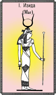 Соответствие классическому Таро. У древних египтян богиня Изида считалась «глазом Ра», египетского правящего бога. Только она обладала знанием его тайного имени, давшего ей неограниченные магические силы. Платон же воспринимал ее как лунное божество. В эллинистический период Изида была защитницей мореплавателей и получила в качестве атрибута руль корабля. Кроме всего этого великая египетская богиня плодородия – мощный символ алхимического превращения. Эта карта соответствует Аркану I классического Таро – Магу.