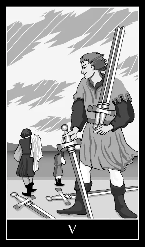 Помним, что любая Пятерка автоматически равно кризис, проблема. Так и Пятерка Мечей не исключение. Она демонстрирует картину проигранной битвы. Таким образом, выпадая в раскладе, карта предвещает невзгоды и неурядицы, даже условную «войну» между людьми.