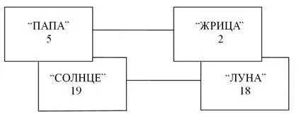 Если разложить три указанных выше карты, то для людей, хоть немного практикующих ТАРО, не составит труда найти в колоде Старших Арканов недостающую карту: карте “Папа” должна сопутствовать женская, немолодая фигура, сидящая на троне. Ни третий Аркан (“Императрица”), ни восьмой (“Правосудие”) не подходят как спутники “Папы” ни по возрасту, ни по названию, ни по рисунку и его мыслесиле. Если положить пятый и второй (кстати, двойка в нумерологии – самая женская, материнская цифра, ведь беременная женщина олицетворяет сразу двух людей) Арканы Марсельского Таро рядом, как на схеме, то мы увидим, как два похоже одетых пожилых человека печально смотрят друг на друга.