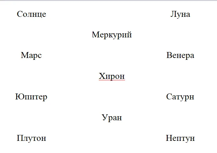 Вторая строка – Марс и Венера (Меркурий и Хирон), планеты второго уровня – индивидуальные качества человека и те внешние обстоятельства, на которые может повлиять любой средний человек.