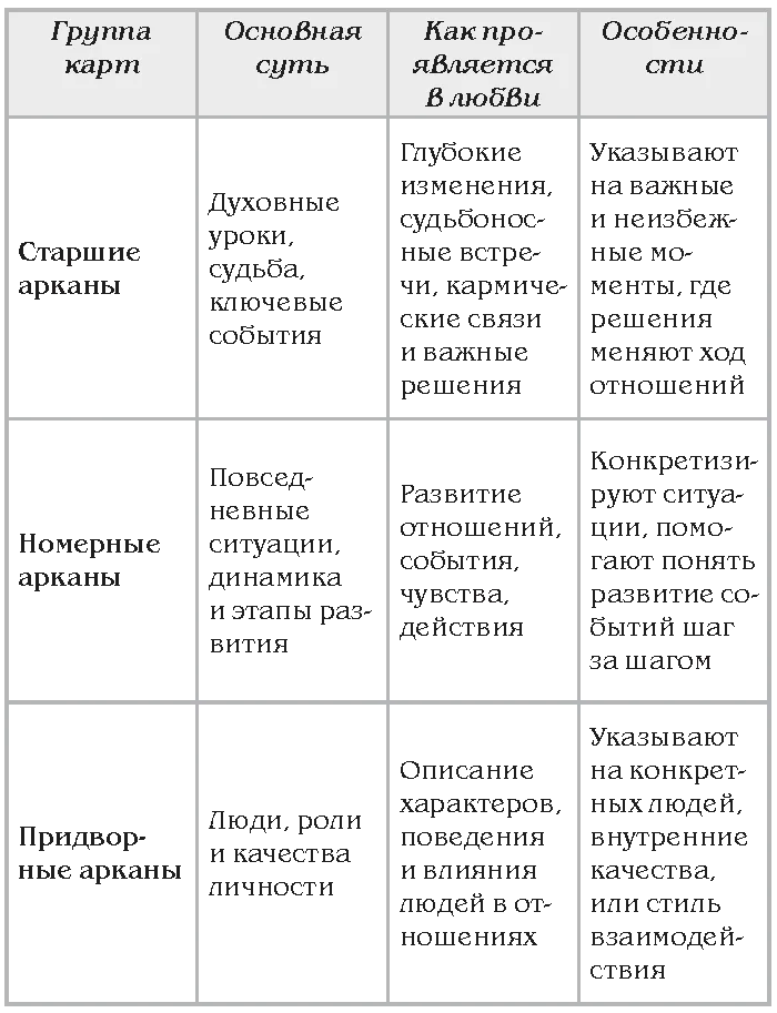 Каждая группа карт помогает увидеть любовь с разных граней как целостный, глубокий и живой процесс – от великих жизненных уроков до повседневных действий и влияния конкретных людей, создавая полное и многогранное понимание отношений.