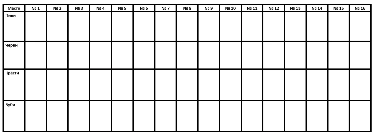 В этом типе строки сверху вниз заполнятся мастями произвольным или случайным порядком.