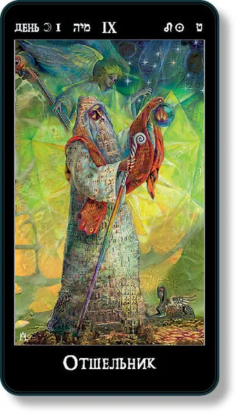 Лампа отшельника – символ дня, а девять – число отшельника и количество божественных отражений, представляющее идею Единого Бога во всем ее абстрактном великолепии. Являясь образом могущества веры, девятка также может выражать все ее проявления, в том числе суеверие и идолопоклонство. Тогда символом карты, как и первого дня, становится жертвенник богини колдовства – Гекаты. Иногда IX аркан именуют «Служением Свету». Это пересмотр всех жизненных позиций, отказ от мирского, суетного, греховного – обращение к высшим ценностям. Отшельник внутри себя отделяет свет от тьмы, обретает истину, которой служит. Пребывая в ней, он говорит: «Вот высшее „Я“, которое есть музыкант, вот мое текущее воплощение – инструмент – и музыка – осмысленная творческая жизнь, которая воистину моя!»