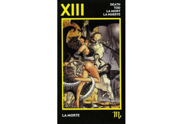 Скелет обнимает женщину – на грани «смерти», «смерть» рядом, прикосновение смерти. Необязательно карта говорит о физической смерти, а может означать смерть чего-то, окончание определенного периода, трансформацию личности, изменение психологического состояния, мыслей, решений, чувств, взглядов, принципов, приоритетов, мировоззрения и т. д.