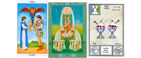 Двойка Чаш – карта, означающая любовь. И на ней Уайт изобразил влюбленную пару. Карта означает любовь и поэтому на ней изображены влюбленные, но это не значит, что карта означат любовь потому, что на ней изображены влюбленные. Та же карта в колоде Тота изображает рыб, а в Таро Церемониальной магии – две вазочки с мороженным, но не смотря на рисунок карты она все равно будет означать любовь, а не рыбалку и не десерт.