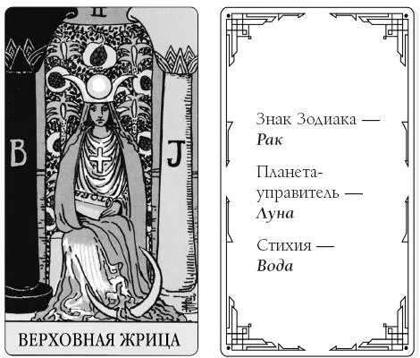 Перед нами карта № 2 – «Верховная Жрица», интереснейшая карта. Как всегда, внимательно посмотрим на неё. Что мы видим: на карте нарисована женщина, не простая женщина, а жрица. Она совершенно спокойна, весь её вид говорит: «Я знаю всё! Но всю правду открыть вам не могу». В складках её покрывала мы видим месяц. Это карта Луны, и это водная стихия.