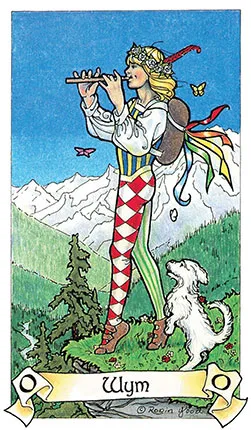 Весь облик Шута – воплощение беззаботности. Длинные золотые кудри, венок и красное перышко в волосах, разноцветные ленты на заплечной торбе, разные штанины – одна клетчатая, другая полосатая, – бабочки, кружащие вокруг… Голубое небо благоволит его пути, а снежные горы на горизонте сурово ждут. Где-то далеко внизу под обрывом струится река. Мир многолик, и Шут без лишних раздумий идет вперед, навстречу неизведанному.