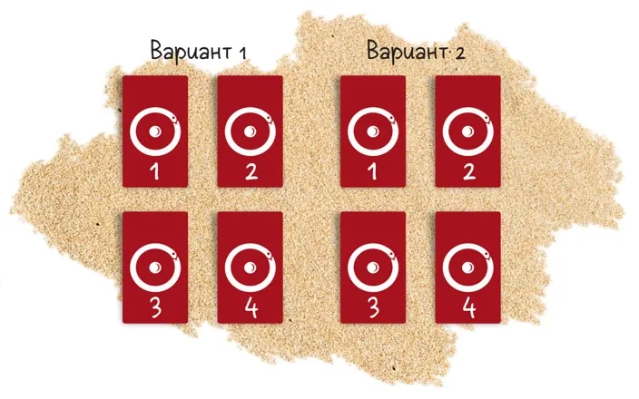 Техника расклада весьма проста: выкладываете четыре карты для Варианта 1 и четыре карты для Варианта 2. При необходимости проделываете то же самое для других вариантов, если они имеются.